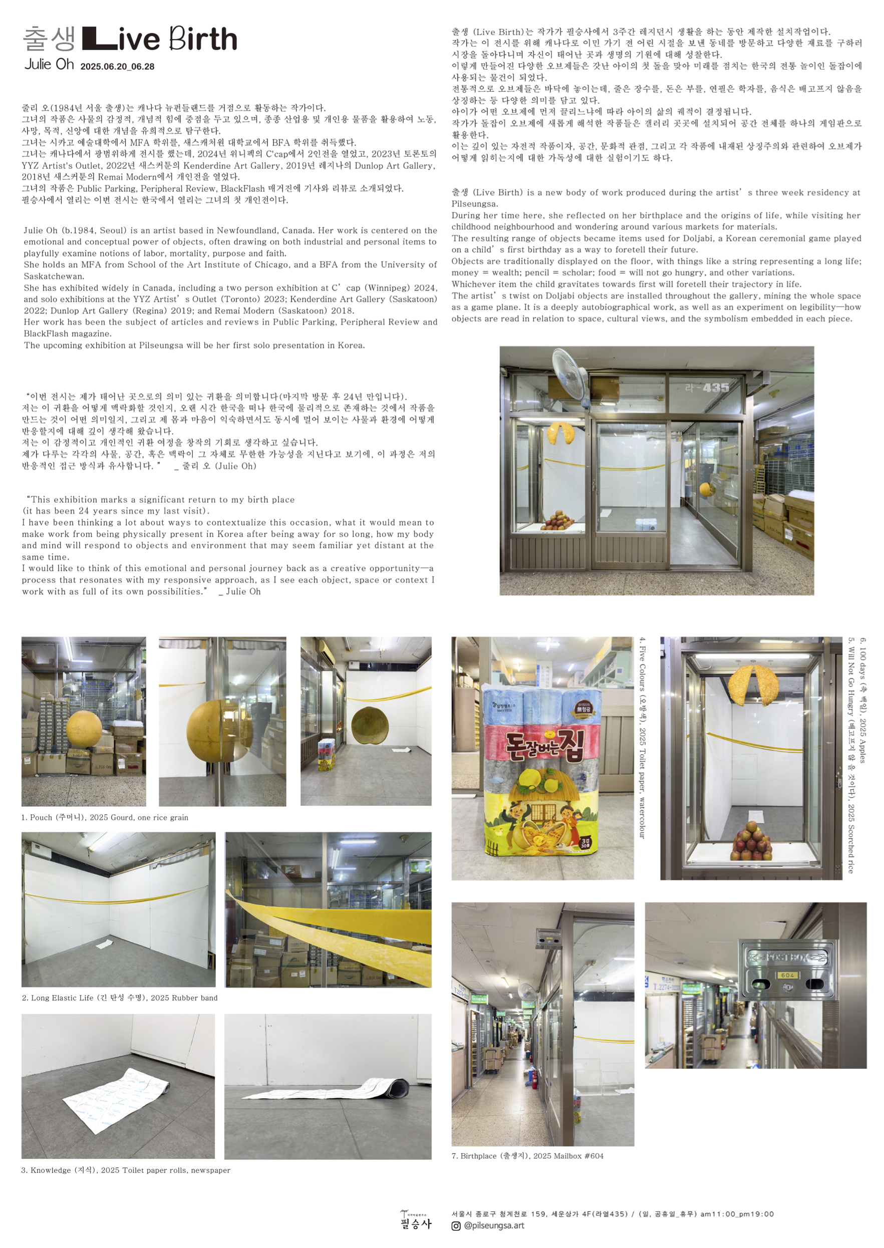 출생 (Live Birth)는 작가가 필승사에서 3주간 레지던시 생활을 하는 동안 제작한 설치작업이다. 작가는 이 전시를 위해 캐나다로 이민 가기 전 어린 시절을 보낸 동네를 방문하고 다양한 재료를 구하러 시장을 돌아다니며 자신이 태어난 곳과 생명의 기원에 대해 성찰한다. 이렇게 만들어진 다양한 오브제들은 갓난 아이의 첫 돌을 맞아 미래를 점치는 한국의 전통 놀이인 돌잡이에 사용되는 물건이 되었다. 전통적으로 오브제들은 바닥에 놓이는데, 줄은 장수를, 돈은 부를, 연필은 학자를, 음식은 배고프지 않음을 상징하는 등 다양한 의미를 담고 있다. 아이가 어떤 오브제에 먼저 끌리느냐에 따라 아이의 삶의 궤적이 결정됩니다. 작가가 돌잡이 오브제에 새롭게 해석한 작품들은 갤러리 곳곳에 설치되어 공간 전체를 하나의 게임판으로 활용한다. 이는 깊이 있는 자전적 작품이자, 공간, 문화적 관점, 그리고 각 작품에 내재된 상징주의와 관련하여 오브제가 어떻게 읽히는지에 대한 가독성에 대한 실험이기도 하다.